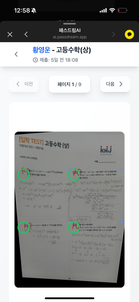 학생이 풀이한 문제를 사진으로 촬영해 업로드하면, 정확도 99.8%의 독자적인 인공지능 모델을 활용해 자동 채점을 수행합니다.