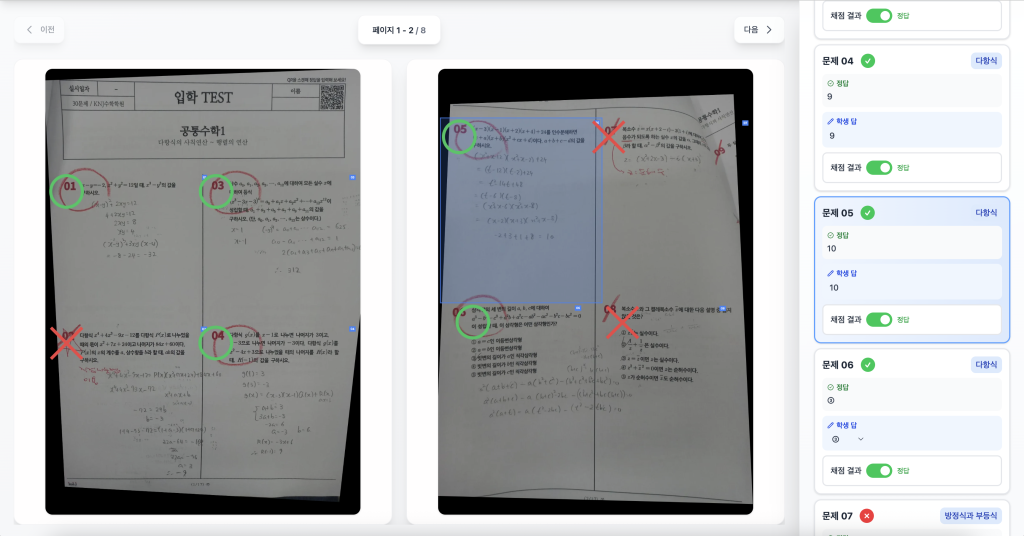 채점자의 주관성이나 피로도로 인한 오류를 원천 차단하고, 매우 높은 정확도로 방대한 양의 종이 문제지를 완벽하게 디지털화합니다. 이는 학원이 신뢰할 수 있는 정교한 학습 데이터를 확보하는 핵심 기술입니다.